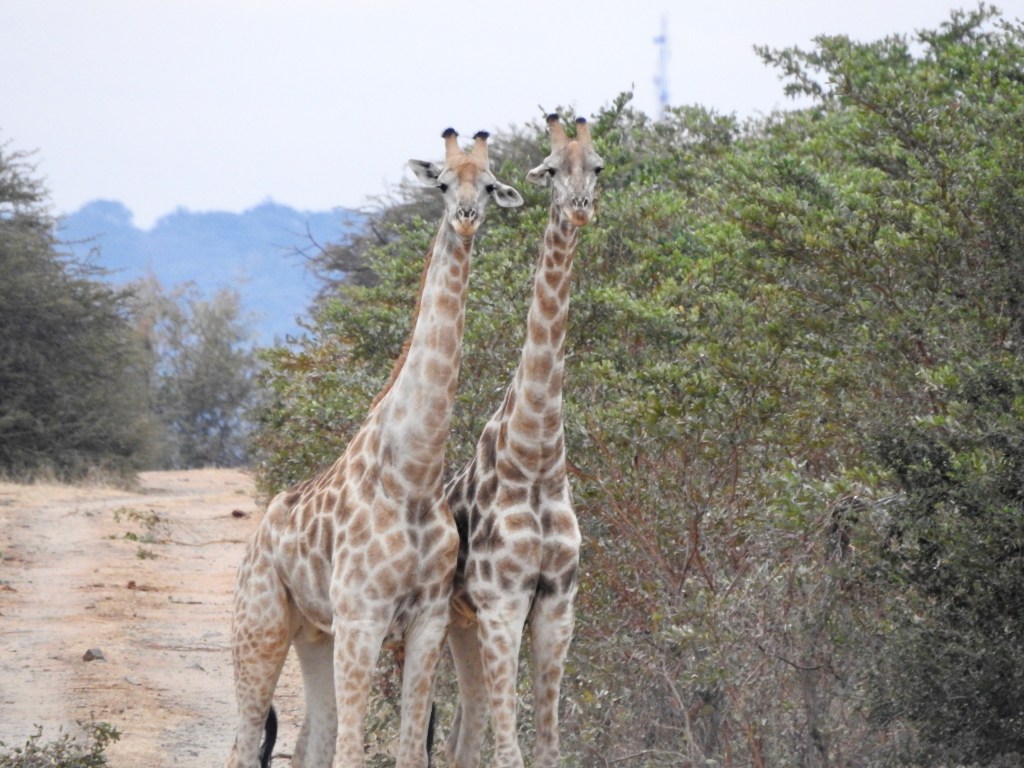 The animal sightings from the vehicles were ample as well. We saw multiple giraffes and zebra, and we were told that walking safaris are also available if booked in advance. In fact, we didn’t even have to leave the lodge to see animals. Warthogs came to graze in front of the open-air lobby every day, and the ever resourceful vervet monkeys hovered near the dining area, eager to steal a snack from an unsuspecting visitor–as John learned firsthand when his pizza was taken right off his plate.